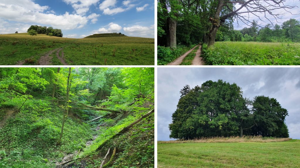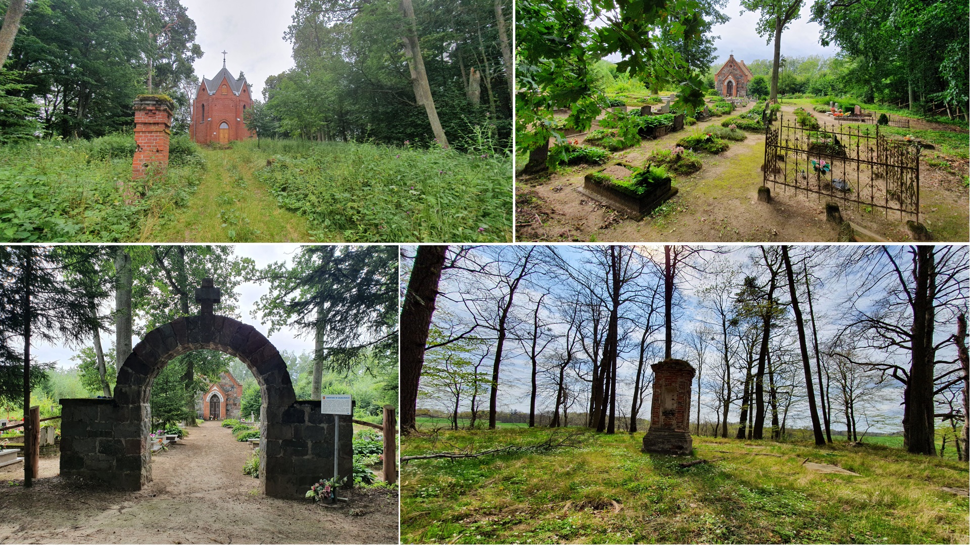 Ryc. Zdjęcia prezentujące walory krajobrazowe miejsc, w których lokowano cmentarze rodowe na przykładzie Ostrowa, Sztynortu, Pityn i Kudyp