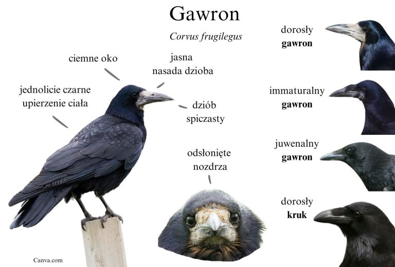 - Gawron: ma czarne upierzenie z nagim dziobem.