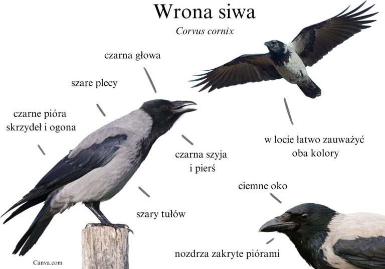 - Wrona siwa: dwukolorowe upierzenie – szary tułów i czarne skrzydła oraz głowa.