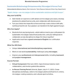 2. mobilność fizyczna w Almerii: 8-17 lipca 2025: warsztaty interdyscyplinarne, wizyty w zakładach produkujących mikroalgi i centrach technologii żywności, sesje gotowania z mikroalg oraz zajęcia kulturalno-sportowe