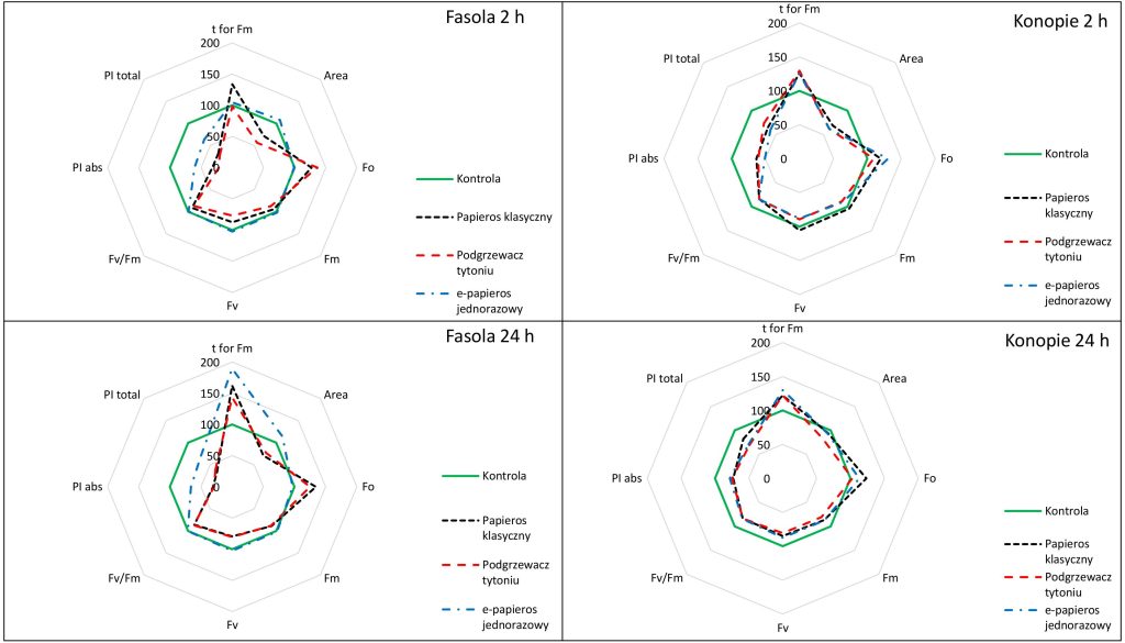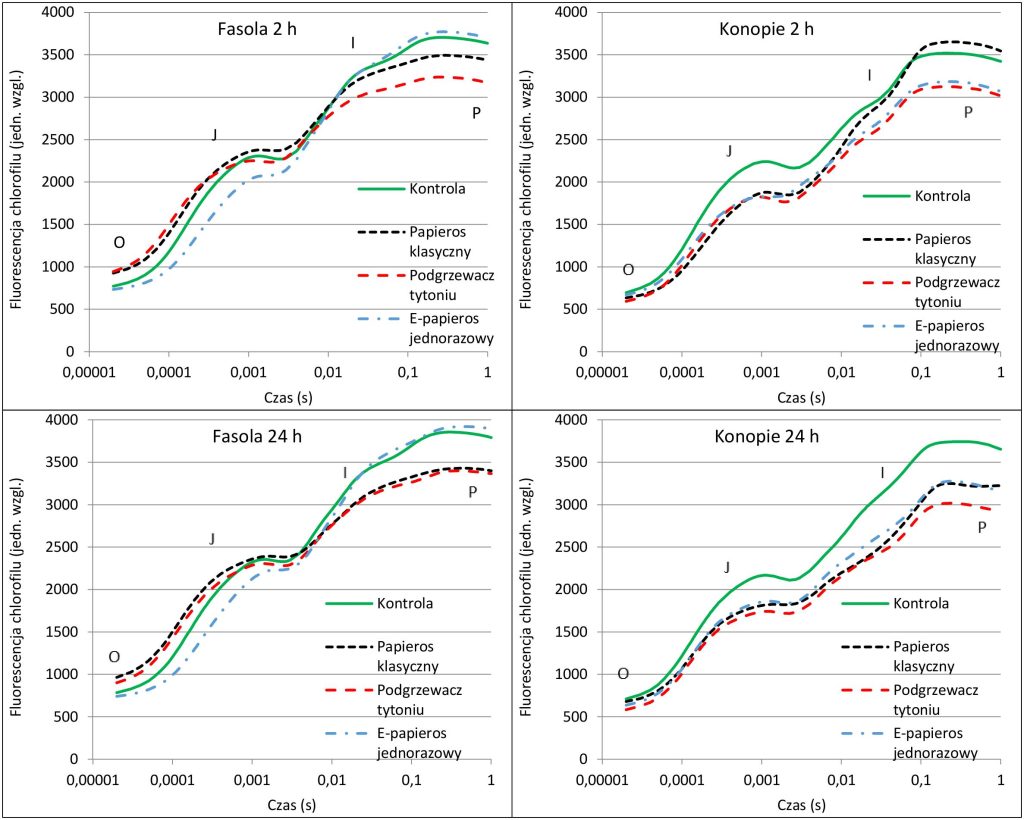 U roślin fasoli dym z klasycznego papierosa oraz podgrzewacza tytoniu wywoływał negatywne zmiany w fazie I–P krzywej indukcji fluorescencji chlorofilu OJIP, co może wskazywać na zakłócenia w transporcie elektronów między fotosystemami (PSI i PSII) oraz na hamowanie redukcji pierwszych akceptorów fotosystemu I (PSI). Natomiast dym z jednorazowego e-papierosa powodował zmiany w fazie O–J krzywej, co świadczy o blokowaniu początkowych reakcji fotochemicznych oraz uszkodzeniu centrów reakcji fotosystemu II (PSII). Podobne reakcje zaobserwowano po 24 godzinach ekspozycji na dym. U roślin konopi negatywne zmiany były widoczne we wszystkich fazach krzywej OJIP (O–J, J–I oraz I–P).