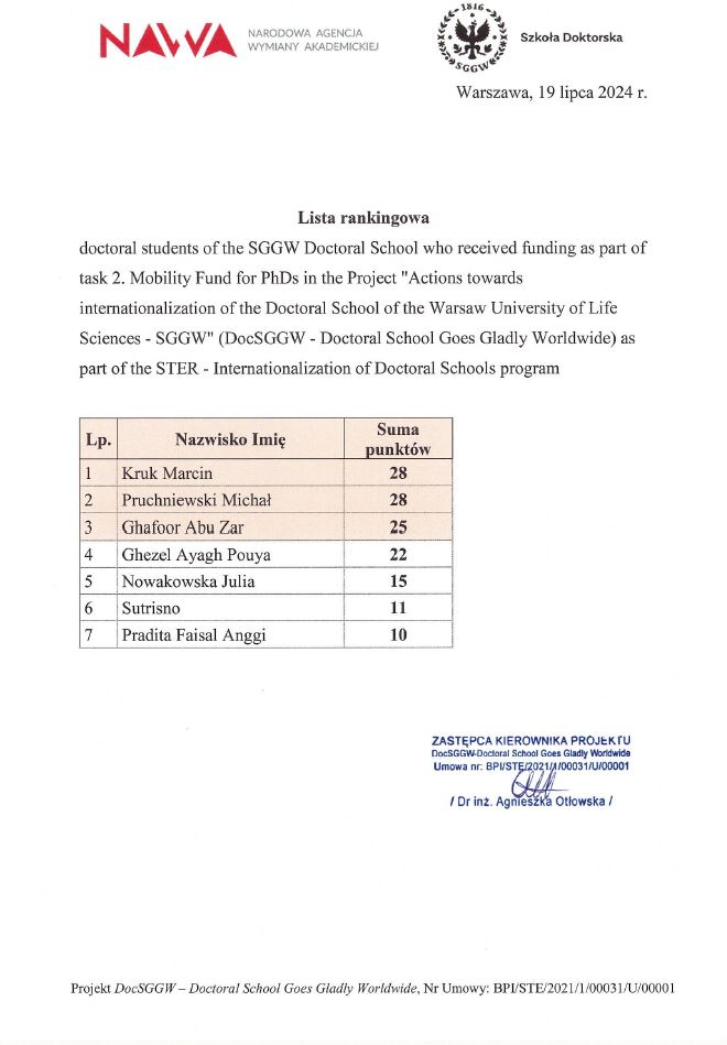 Ranking list of applications 2. Mobility Fund for PhDs w Projekcie „Actions towards internationalization of the Doctoral School of the Warsaw University of Life Sciences – SGGW” (DocSGGW – Doctoral School Goes Gladly Worldwide) w ramach programu STER – Internationalization of Doctoral Schools.