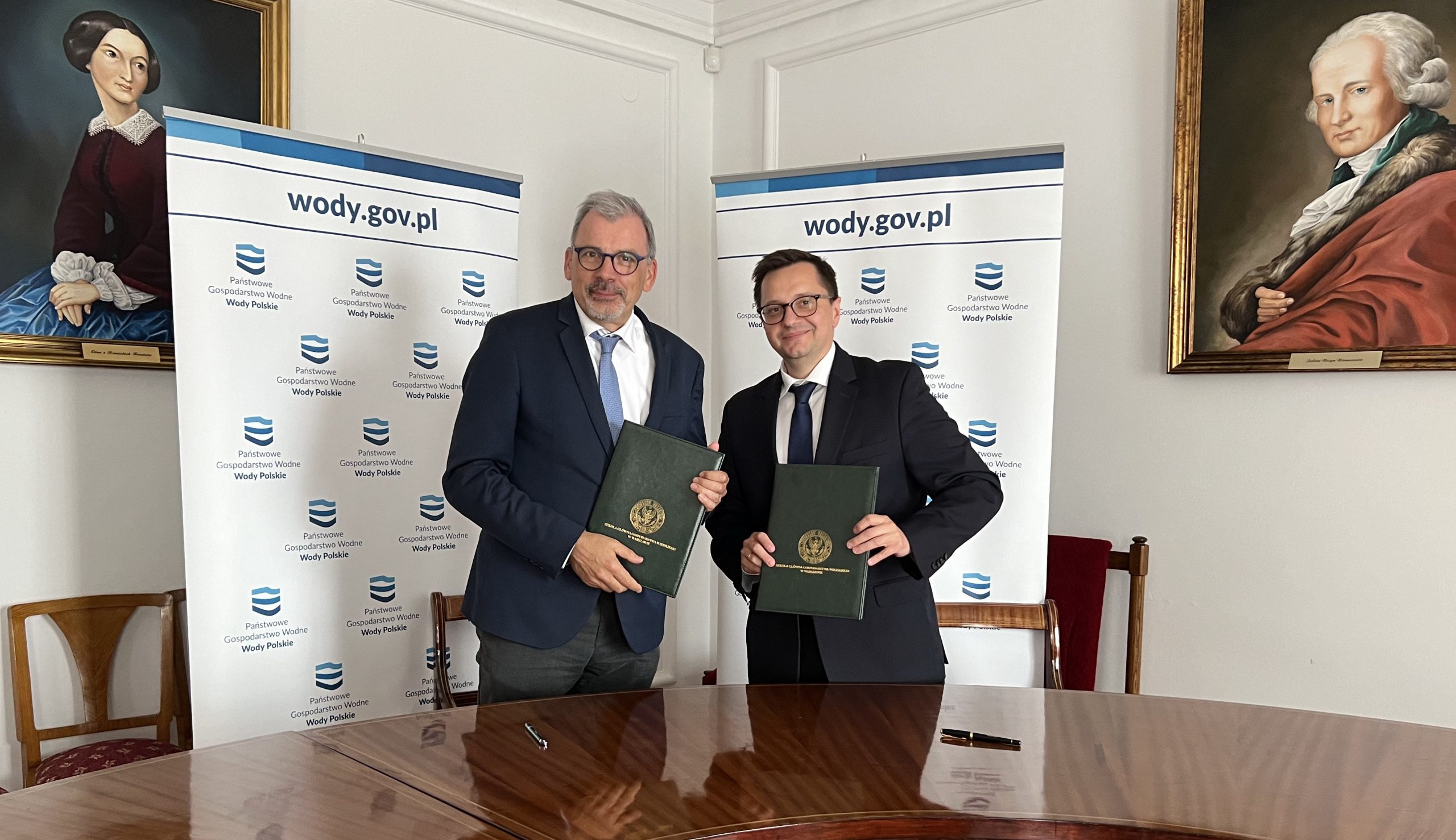 Prof. dr hab. Tomasz Okruszko, Prorektor ds. nauki SGGW oraz Mateusz Balcerowicz, Zastępca Prezesa Państwowego Gospodarstwa Wodnego Wody Polskie do spraw Ochrony Przed Powodzią i Suszą podpisali (14.06.2024) porozumienie o współpracy w obszarze gospodarki wodnej, w zakresie badawczym, edukacyjnym i kadrowym.