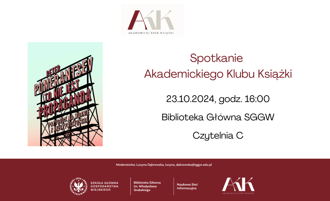 W sprawach związanych z aktywnością Akademickiego Klubu Książki prosimy o kontakt z koordynatorką – Lucyną Dąbrowską lucyna_dabrowska@sggw.edu.pl