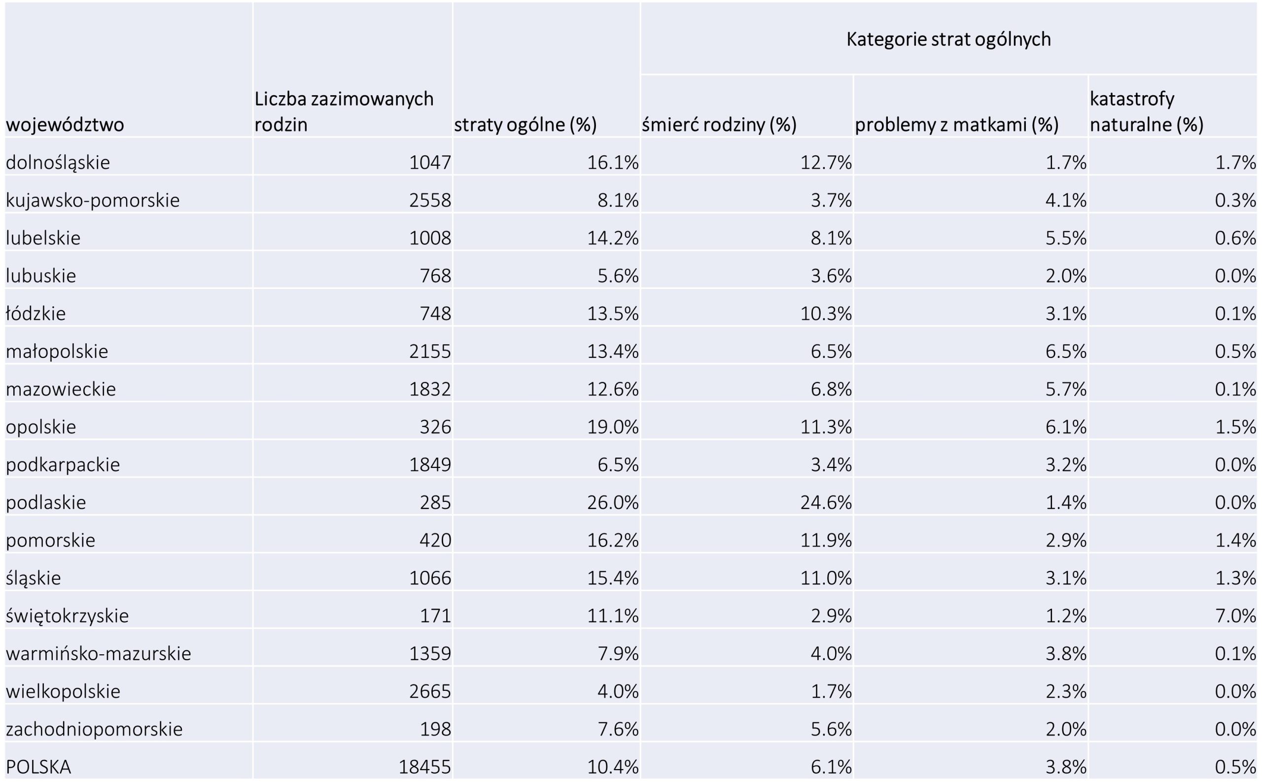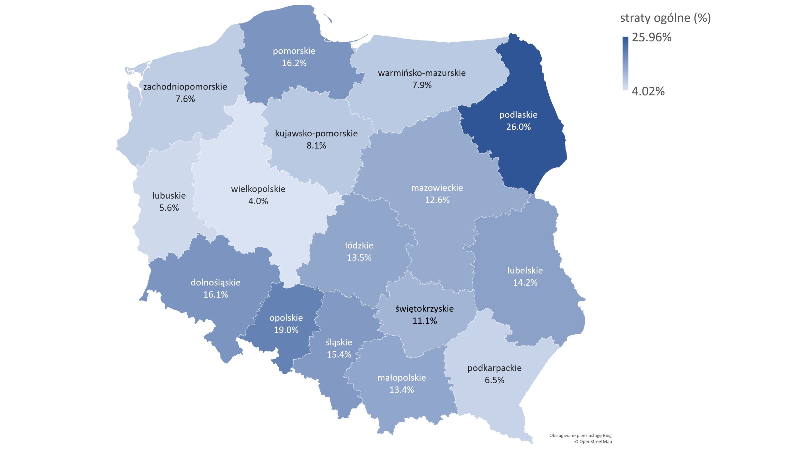 Poziom strat ogólnych zdecydowanie różnił się między województwami. Najwyższe straty ogólne odnotowaliśmy w województwach: podlaskim (26%) i opolskim (19%); najniższe: wielkopolskim (4%) i lubuskim (5,6%) (Mapa 1 ). Szczegóły dotyczące kategorii strat przedstawiamy w Tabeli 1.