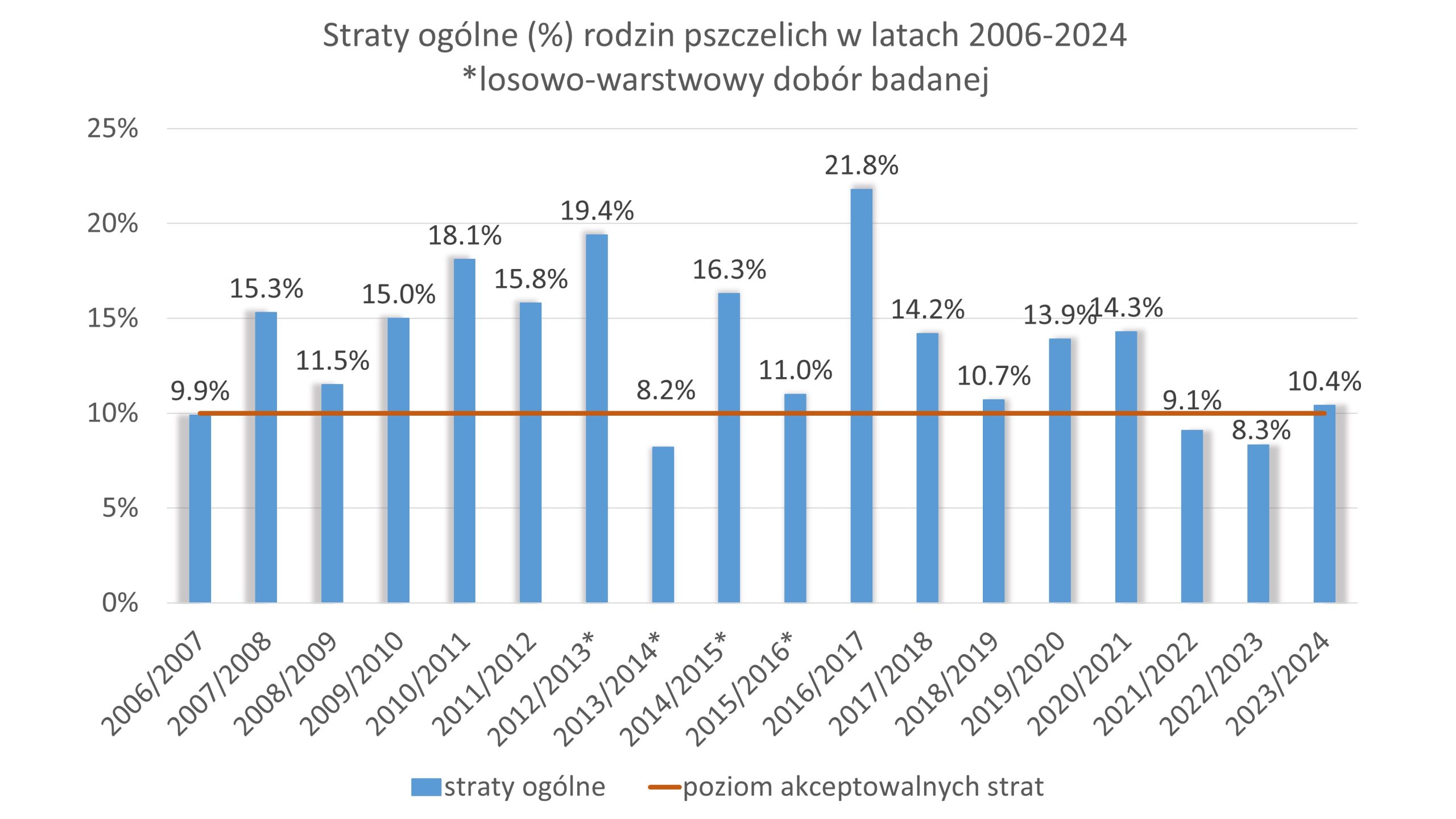 Pszczelarze raportowali, ile rodzin stracili w trakcie zimy 2023/2024 w poszczególnych kategoriach tj.: strata rodziny z powodu kłopotów z matką pszczelą, strata rodziny z powodu katastrofy naturalnej, strata rodziny z powodu jej śmierci. Respondenci łącznie zgłosili utratę 1921 rodzin pszczelich. Straty ogólne w Polsce wyniosły 10,4% i były na granicy akceptowanego poziomu. Sytuacja jest bardzo pozytywna, gdyż jest to trzeci rok z rzędu, w którym nie odnotowujemy wysokich strat pszczół (akceptowalny poziom strat zimowych w Polsce to 10%) (Wykres 1).